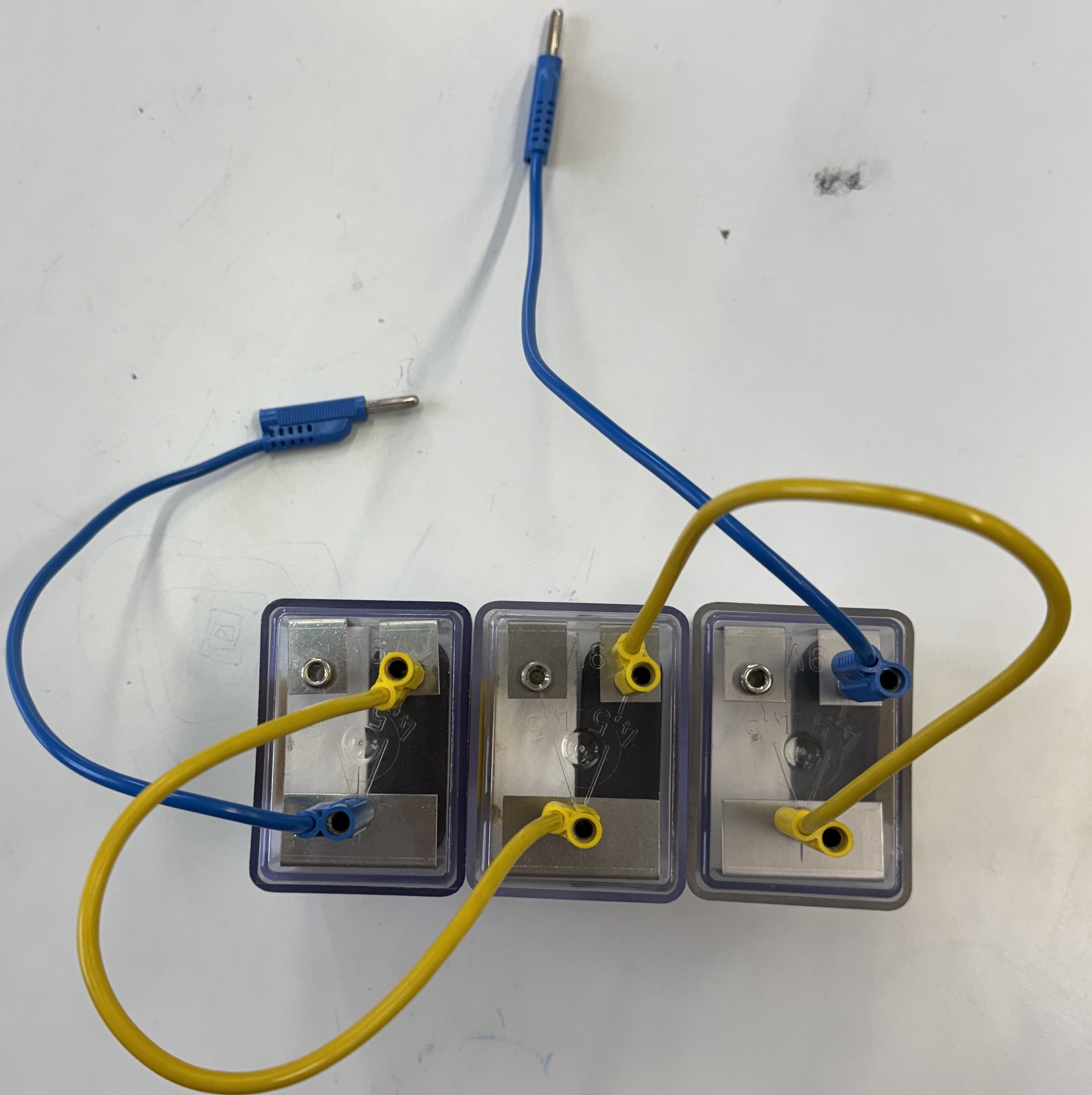 Bauen Sie die Batterieblöcke in Reihe zu einer Spannungsquelle von ca. 13,5V zusammen. Achten Sie darauf, dass der Pluspol der einen Batterie an den Minuspol der benachbarten Batterie angeschlossen wird.