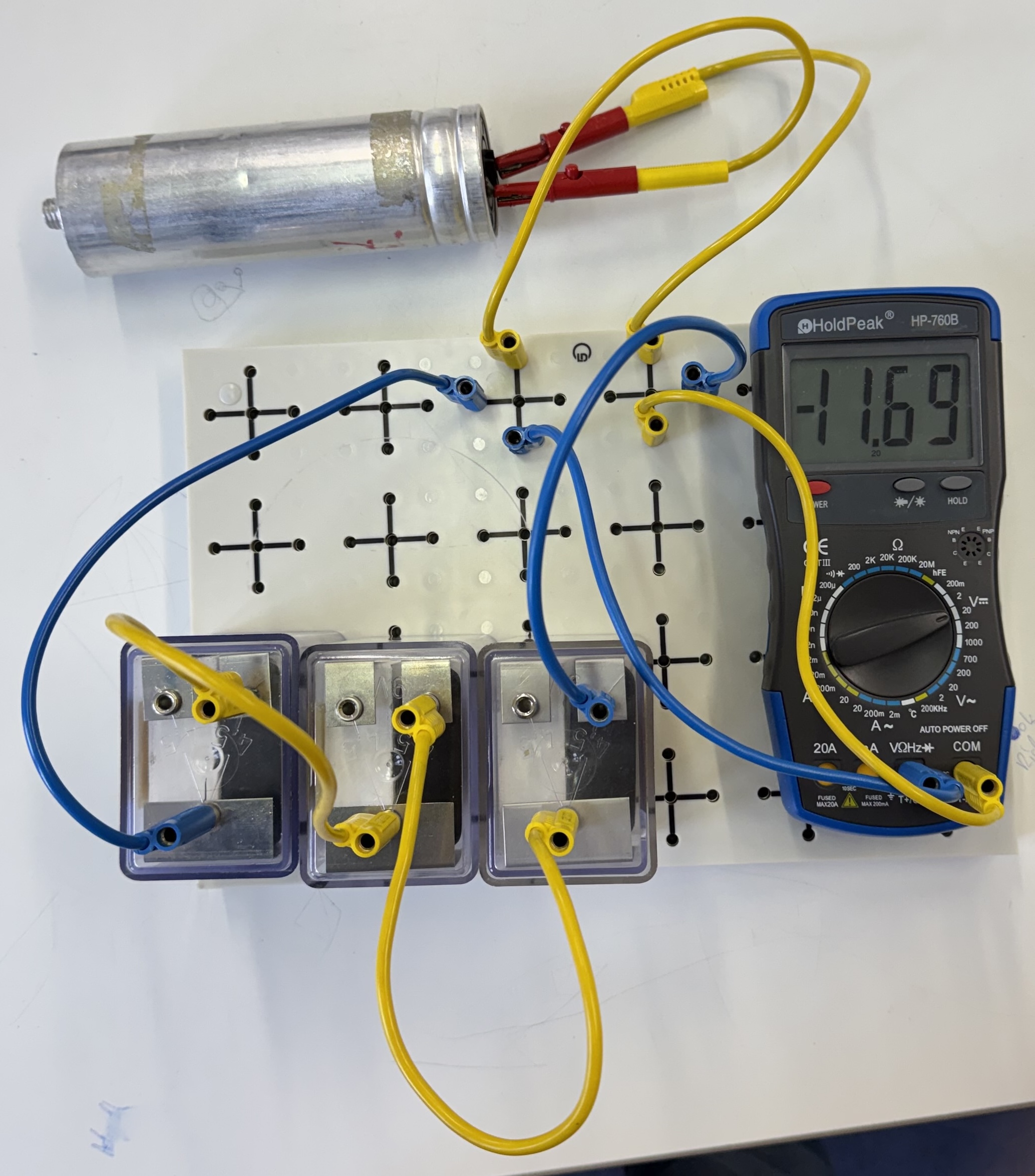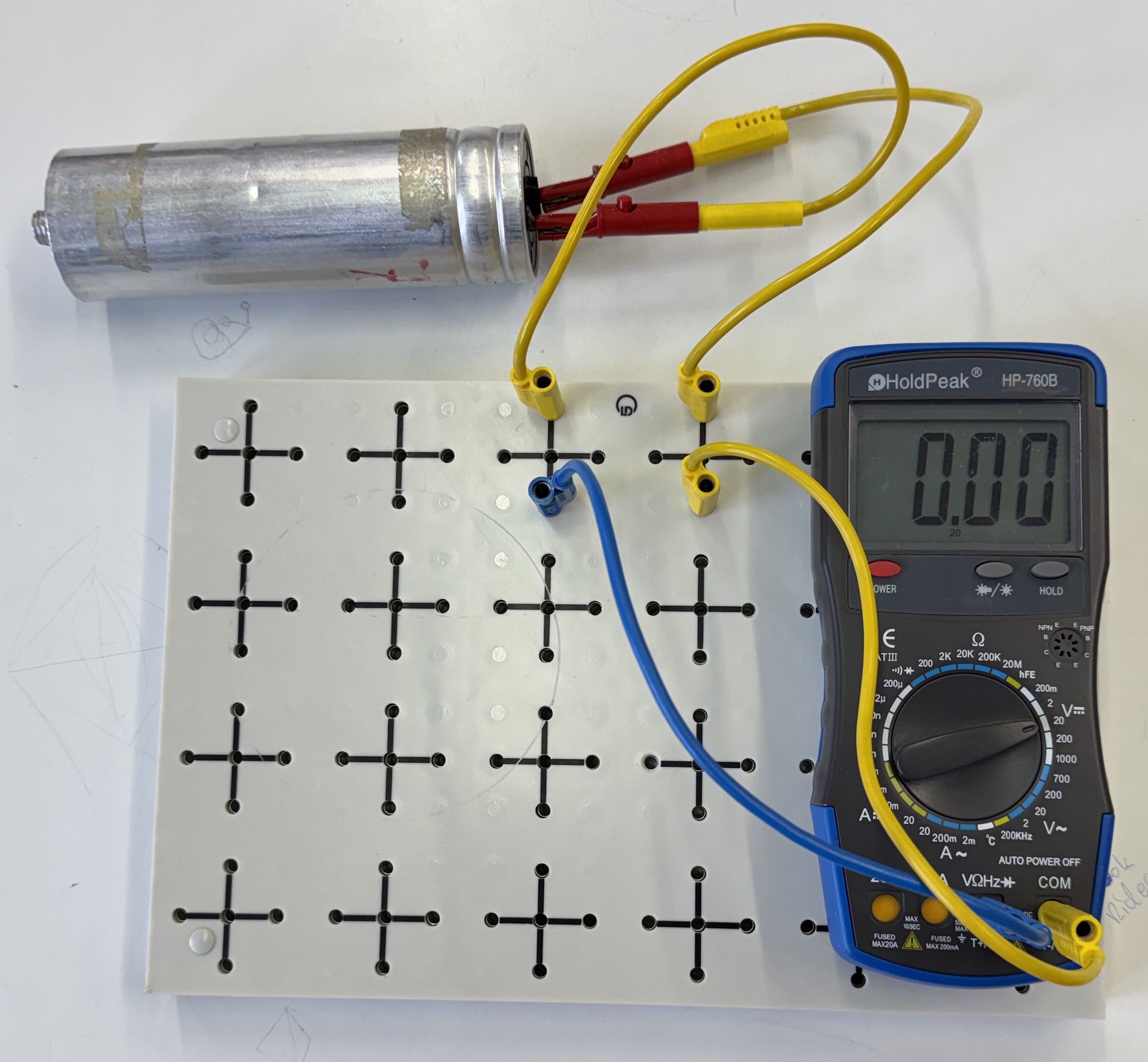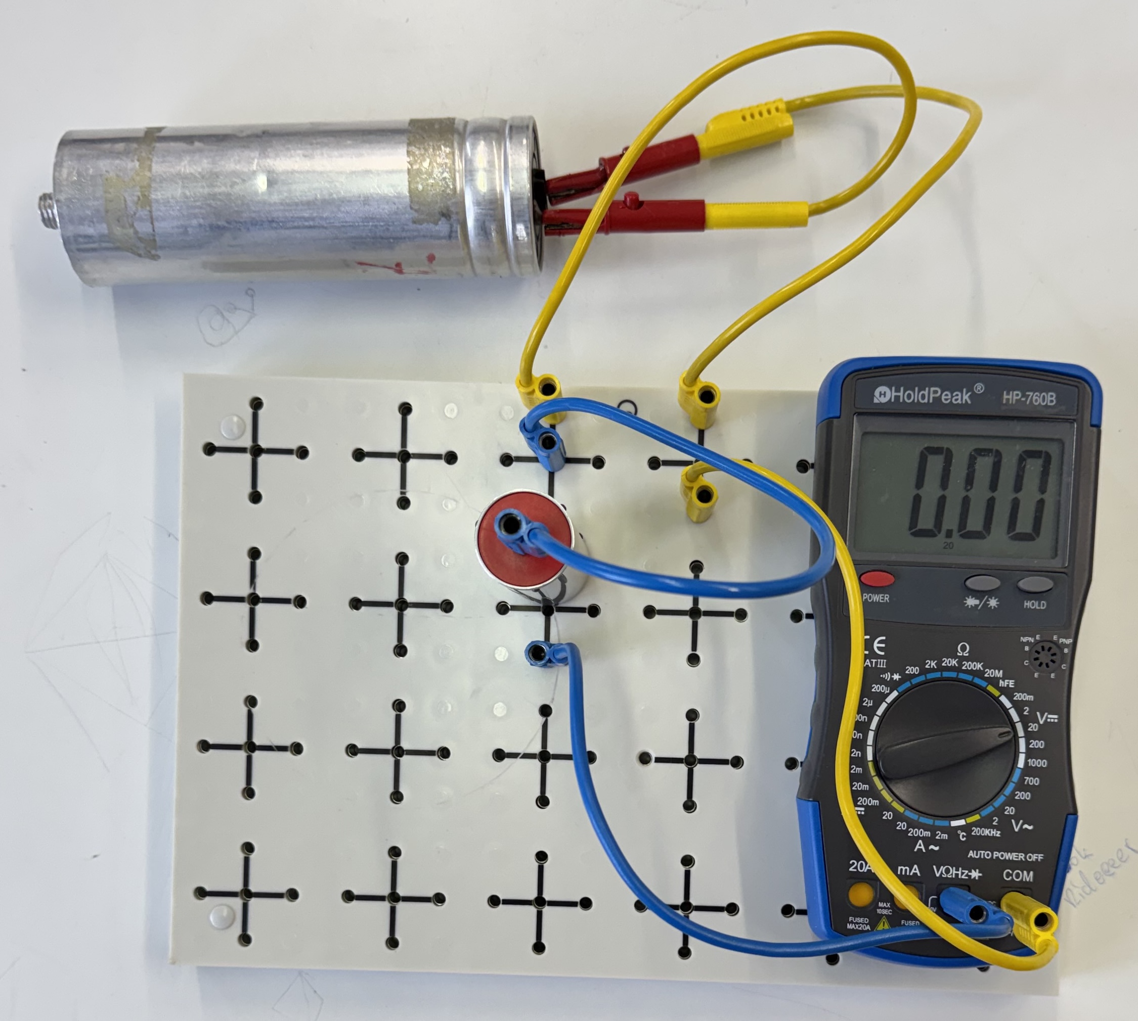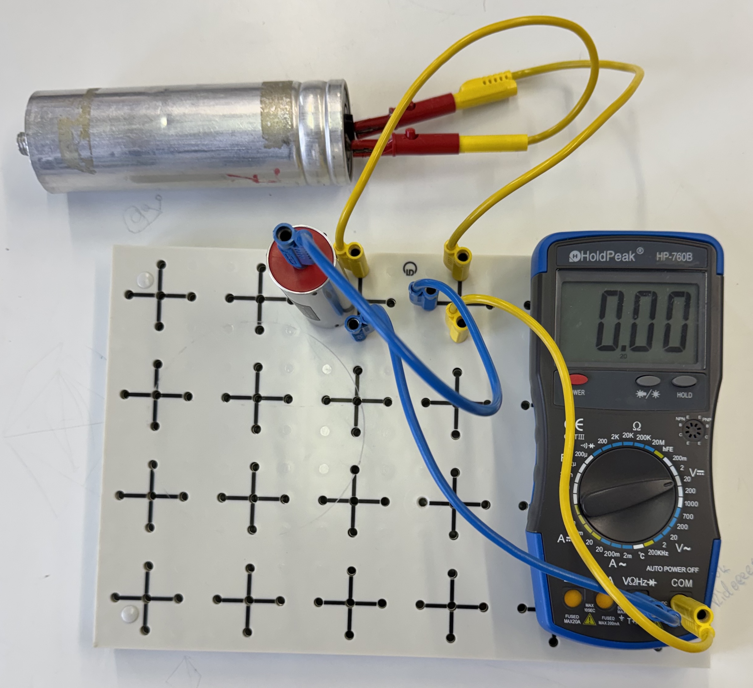 Verbinden Sie den Kondensator und das Messgerät so zusammen, dass die Entladung über den Innenwiderstand R_i des Multimeters stattfindet.